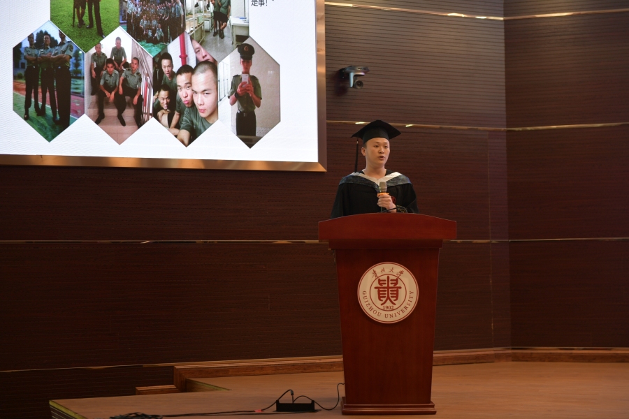 汇报会上,七位毕业生代表分享了他们与贵大的精彩故事。美术学院2018级设计学硕士生黄海涛已被四川大学拟录取为博士研究生,他讲述了自己在参与贵州省乡村振兴及贵州地方文化传播实践中的经历和思考。