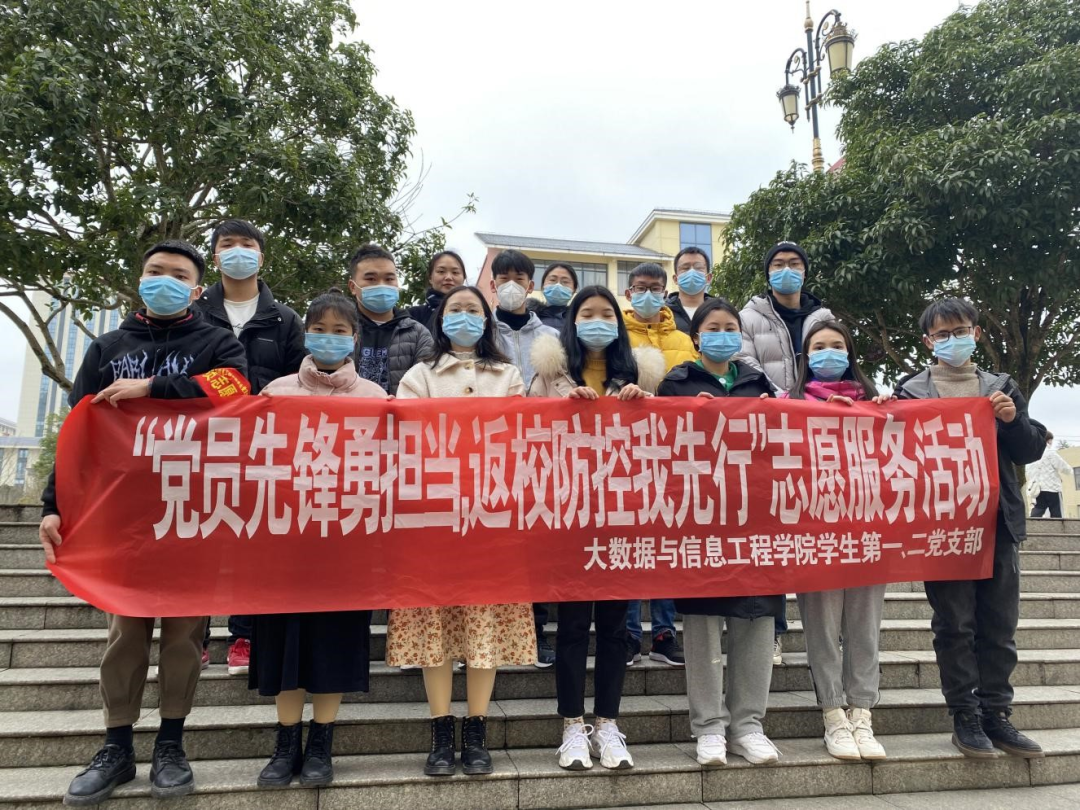 为确保新冠肺炎疫情常态化防控期间返校复学工作安全、有序地进行,同时为更好地发挥学生党员、入党积极分子的先锋模范作用,激励广大学生党员、入党积极分子坚定理想信念,增强责任意识、服务意识、表率意识,践行党的宗旨,保持党的先进性。大数据与信息工程学院学生第一、第二党支部于2022年2月27日联合开展了以“党员先锋勇担当,返校防控我先行”为主题的志愿服务活动。大数据与信息工程学院学生第一、第二党支部部分师生党员、入党积极分子参与活动。