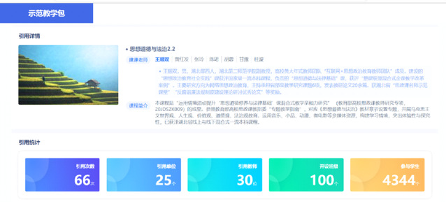 日前,已有贵州中医药大学、西南石油大学、河北工程大学、新疆石河子职业技术学院、上海民航职业技术学院、鹤壁职业技术学院等25个单位引用,开设班级突破100个,校外参与的学生已经有4300多人,为全国各地的思政课教师和学生提供了优质的教学资源服务。
