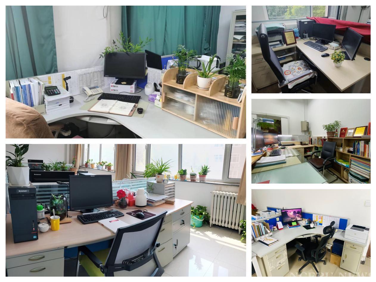 为加强师生交流,本次评委团由学生组成。评委们严格按照评比细则对各工位及办公室进行了检查,并认真记录检查结果。通过评委的细致观摩,最终考核、评选结果为:参评单元全部达标,最终评选出“最美工位”5个、“最美办公室”6个。“最美”评选单元均布置得简洁优雅,书籍资料及办公用品摆放整齐。办公桌上放置的电脑增高架和收纳盒,营造出优美的办公环境;盆景、鲜花等绿色植物,则是为办公室增添了几分绿意。