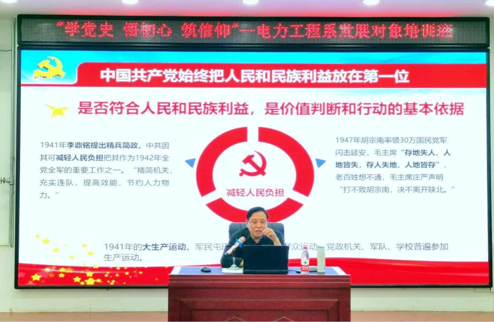 为进一步加强发展对象对党的历史、初心、宗旨的理解,提高发展对象的党性修养,更加深入明确入党动机、了解中国共产党历史功绩以及未来发展新征程,电力工程系于5月20日下午在教九报告厅开展“坚守初心矢志不移,牢记使命奋斗不止”发展对象专题党课的学习。本次专题党课由原华北电力大学校党委副书记、副校长,学校党史学习教育第五巡回指导组组长张金辉主讲,电力系党委书记屈朝霞主持,电力系党委副书记韩金佐,团委书记崔帅,辅导员曹扬以及140余名发展对象参加。