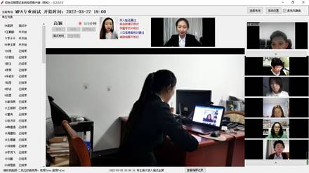 为了预防和应对线上复试过程中的各种突发状况,党员韩彩欣研究生秘书提前服务全体考生,确保公平、公开、及时参加复试还担任复试小组组长,多次组织复试考生召开复试工作视频培训会议,为各位考生详细讲解学信网远程招生面试系统使用方法、线上笔试和面试流程、主要注意事项等;。各学科提前组织复试考生进行模拟演练,确保复试过程中视频和声音的清晰度和流畅度。