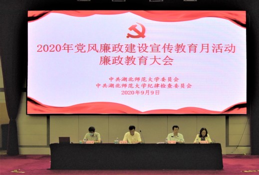 为贯彻落实湖北省委《2020年全省党风廉政建设宣传教育月活动方案》有关精神,9月9日下午,学校2020年党风廉政建设宣传教育月活动廉政教育大会在教育大楼学术报告厅顺利召开。全体在校领导,校党委委员、纪委委员,副处级以上领导干部,教职工纪检委员参会。会议由校长、党委副书记李宏主持。