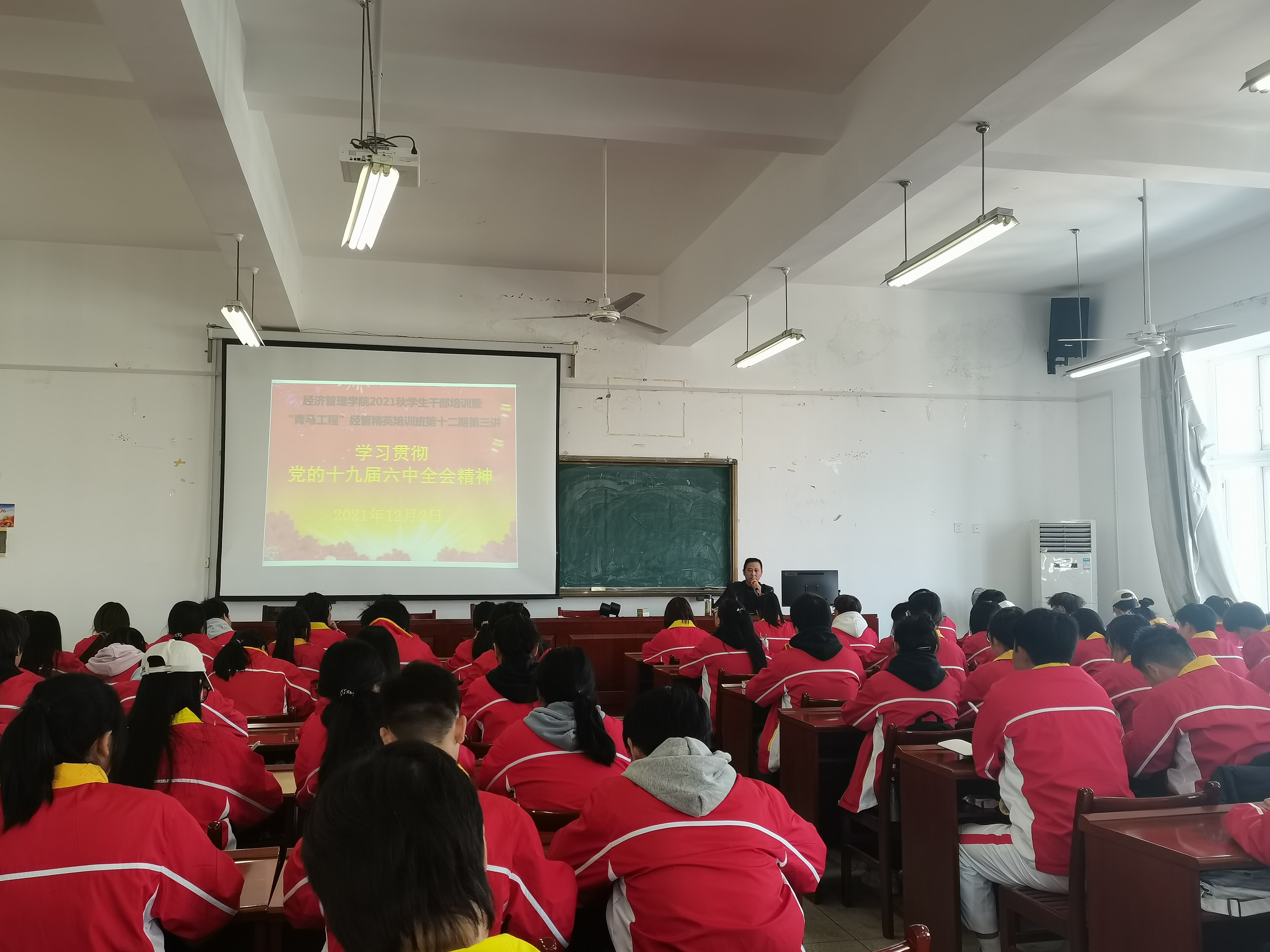 为深入学习贯彻党的十九届六中全会精神,12月2日下午,经济管理学院2021年秋季学期“青马工程”培训班第三讲在J1-628举行,学院党总支委员、副院长杨长华就党的十九届六中全会精神进行了深入解读,学院全体团学干部参加了培训学习。