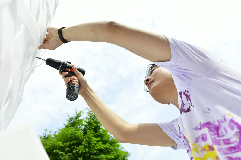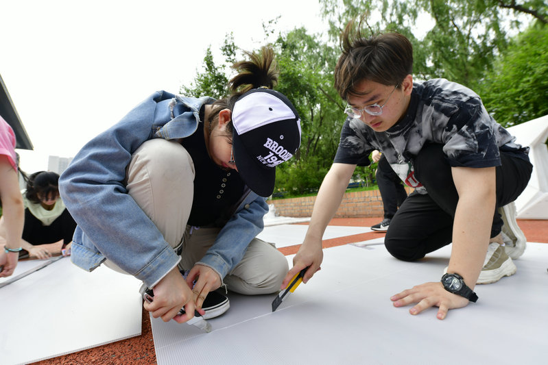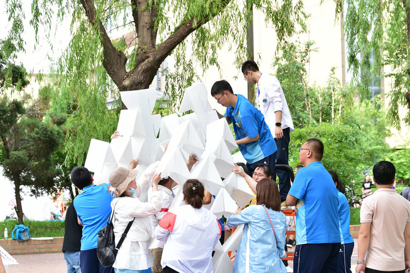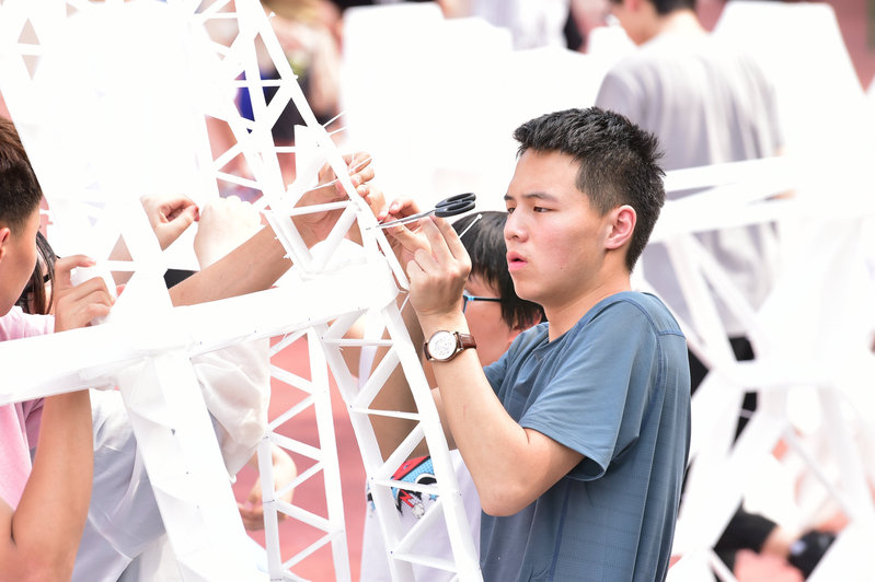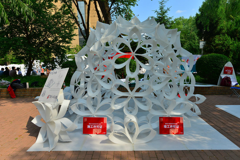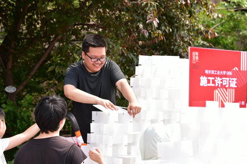 建造节是建筑学院组织承办的大型精品实践类竞赛之一,旨在通过团队合作、动手实践的方式激发学生的创造潜能,加强对空间建构的理解,共分为两个板块:百年校园现场建造与百所高中校园建造。建筑学院一、二年级25组大学生队伍,哈尔滨市第三中学、大庆市实验中学、牡丹江市第一高级中学、东北师范大学附属中学等11所高中队伍参赛,另有山东省实验中学、四川省成都树德中学等14组高中队伍在自己的校园内远程参赛。