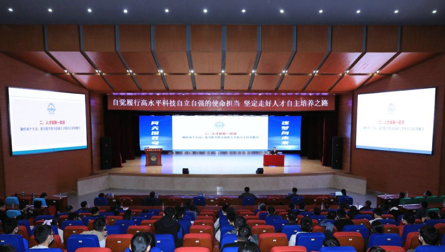 韩杰才从7个方面为同学们介绍了我校提升人才自主培养能力的思路与举措:一是优化人才培养结构布局,强化基础、重视应用、特色培养,优化学科专业结构、人才培养类型结构,加强科教、产教融合协同育人基地建设;二是深化拔尖创新人才选拔改革;三是创新人才培养模式,着力构建2+X多元人才培养体系;四是完善人才使用机制,拓宽毕业生发展路径,加大拔尖创新人才支持力度,优化青年人才发展制度环境;五是健全科学评价制度,科学设立人才培养评价指标、构建多元主体联合评价和拔尖学生长周期评价;六是加强高水平教师队伍建设,强化名师引领作用,完善教师发展与激励机制;七是加大稳定支持力度,强化课程教材建设、加强保障条件建设和多元化经费支持。