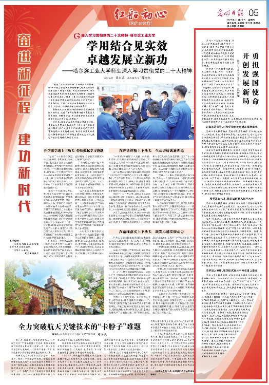 哈工大全媒体(马晓雪/文)11月24日,《光明日报》“红船初心”专刊整版报道我校师生深入学习贯彻党的二十大精神,刊发校党委书记熊四皓署名文章《勇担强国使命 开创发展新局》。