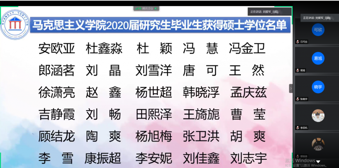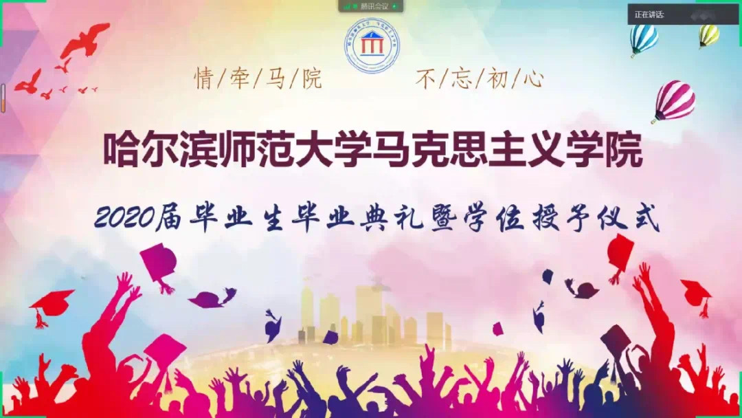“多年师生情,今昔恨别离。满堂祝福语,只赠学子行”。在缤纷多彩的六月,马克思主义学院运用腾讯会议隆重举行2020届毕业生“云”毕业典礼暨学位授予仪式。马克思主义学院博士生导师、院长段虹教授、学院党委书记慕海军老师、副院长胡菊华教授、副院长刘爱军教授、副院长白夜昕教授、副处级辅导员孙鹏飞老师、思想政治教育系主任王婷教授、思政部主任姜立红副教授、各教研室主任、党支部书记及学院全体教师出席仪式,2020届博士、硕士、本科毕业生参加。