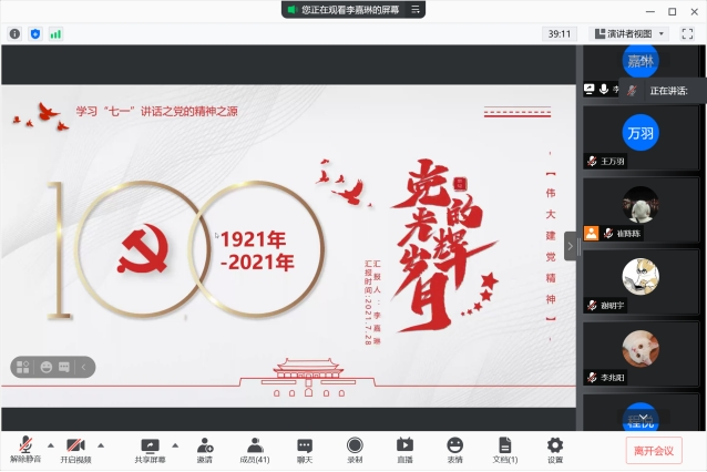 中国共产党领导中国各族人民奋斗100年的峥嵘岁月和光荣业绩,如同一幅波澜壮阔而又气势磅礴、跌宕起伏而又绚丽多彩的画卷,展现在世人面前。为推进党史学习教育走深走实,引导青年学生学好百年党史、感悟初心使命、凝聚奋进力量,2021年8月11日,土木与水利工程学院本科生第五党支部以“党的光辉岁月”为主题开展聚焦建党百年线上学习活动,党支部全体党员参加了本次活动。