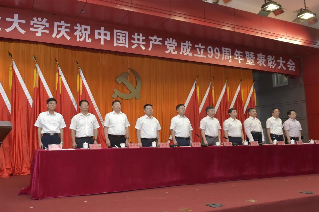 校党委书记余其俊在会上发表讲话。他首先代表学校党委向受到表彰的先进党组织、优秀共产党员、优秀党务工作者和新加入党组织的同志表示祝贺,向全校共产党员致以节日的问候。他说,99年栉风沐雨,99年波澜壮阔,党带领中国人民和中华民族不懈奋斗,走过99年的伟大历程,取得举世瞩目的成就。崇高的事业需要榜样的引领,党99年来壮丽辉煌的成就,正是一代又一代中国共产党人同中国人民接续奋斗的结果。他指出,近年来,学校大力加强基层党组织建设、党员干部队伍建设和思想政治工作,以党建为统领,充分发挥广大党员先锋模范作用,广泛凝聚各方面力量,齐心协力,共同助推学校发展,营造了积极向上、风清气正、干事创业的良好教育生态。学校各级党组织和广大党员认真落实党委的决策部署,在各个单位和各自的岗位上发挥了政治保证作用和先锋模范作用。今天表彰的先进集体和优秀个人就是其中的代表。学校全体党员都要以优秀楷模为标杆,将学习对标的行动融入学校建设发展的奋斗之中。