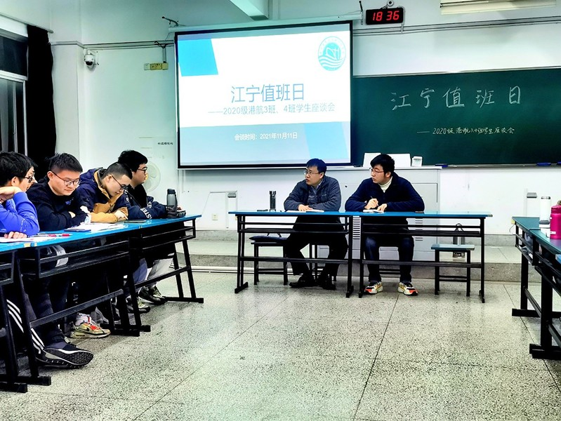 2021年11月11日,支部党员张蔚教授于江宁校区致高楼B411,与2020级港航3、4班全体同学进行座谈,意在了解学生的思想动态,解决同学们关于专业学习、课程安排、职业生涯规划等问题。