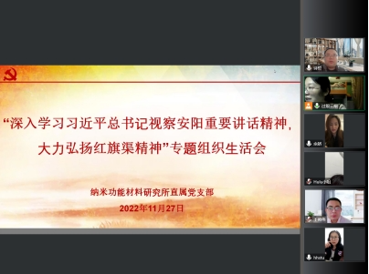 为深入学习贯彻党的二十大精神和习近平总书记视察安阳的重要讲话精神,2022年11月27日,纳米所党支部组织召开了“深入学习习近平总书记视察安阳重要讲话精神,大力弘扬红旗渠精神”线上专题组织生活会,会议由支部书记张守仁主持,支部全体党员参加。