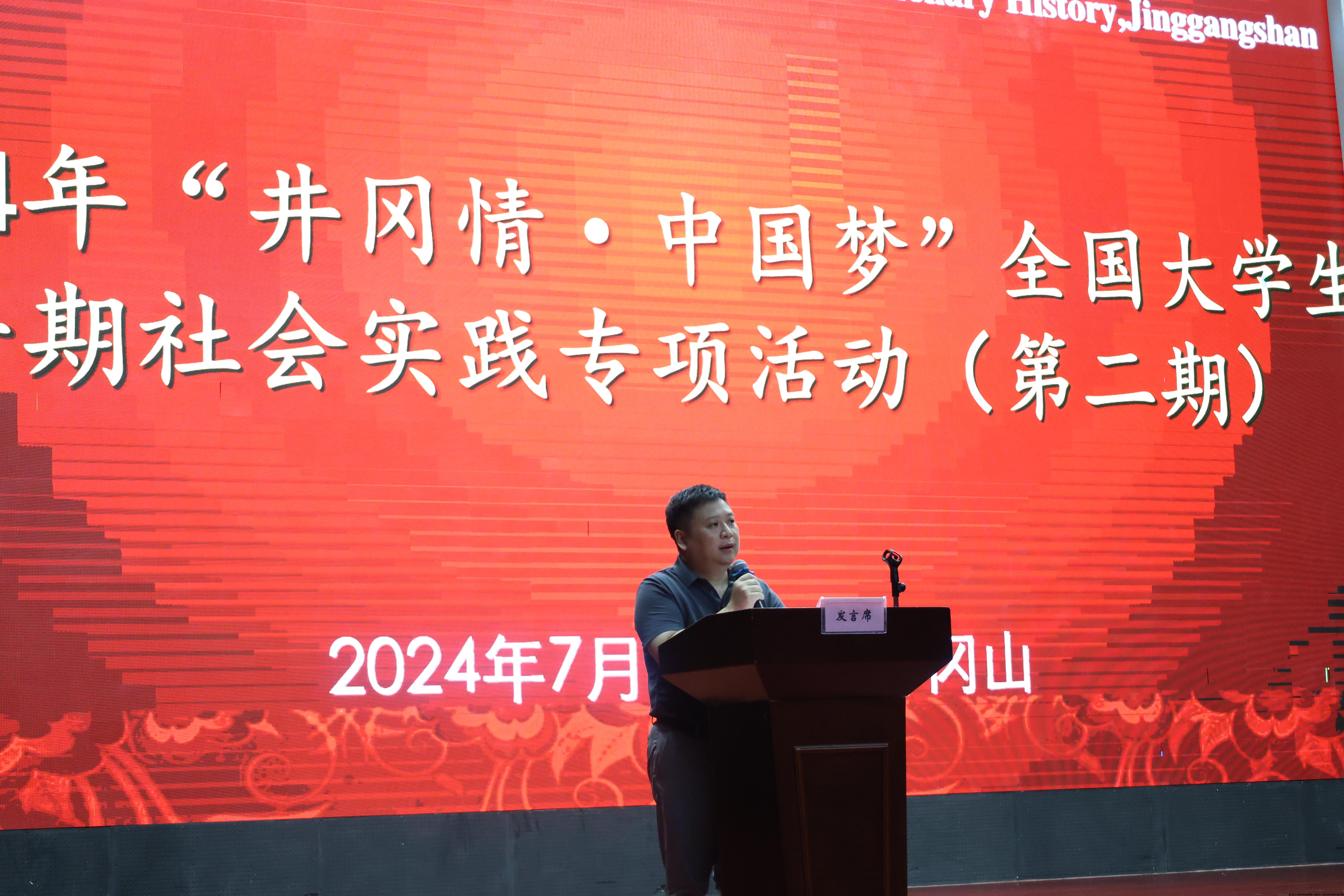 7月12日上午,2024年“井冈情·中国梦”全国大学生暑期社会实践专项行动(第二期)开营仪式在全国青少年井冈山革命传统教育基地报告厅举行。井冈山中心办公室主任兼教研处处长滕永琛对本次社会实践活动表达殷切希望,他殷切期望每位青年才俊能深刻理解,探究井冈山精神的意义远超乎对过往历史的缅怀与尊崇,它是一股不竭的红色动力源泉,是传承革命火种、汲取奋进勇气的关键路径。他激励每位学员,在即将展开的实践活动中,不仅要有所领悟,更要实现自我提升与蜕变,让井冈山精神的光芒照亮前行的道路。随后,学员代表、教师代表分别发言,班主任宣读《学员纪律》强调实践期间的纪律要求和安全注意事项,22支团队通过歌曲、朗诵等多种形式依次进行了团队风采展示,我校实践团以“我们工商青年,重走井冈路,再叙井冈情”为口号,以诗朗诵的形式展示了我校师生风采和精神面貌。