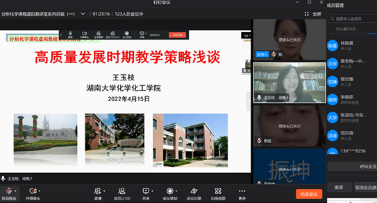 为进一步开展跨校教研交流,加强师资培训,“分析化学课程虚拟教研室”推出了系列讲座,4月15日晚的第一期讲座由“分析化学课程虚拟教研室”带头人、湖南大学王玉枝教授主讲,在虚拟教研室线上会议室举行,讲座题目为“高质量发展时期教学策略浅谈”,140位虚拟教研室成员参与了本次讲座。王玉枝教授首先对分析化学课程虚拟教研室的属性、构成、初步规划、系列讲座和前期建设情况做了简要介绍。随后,她从教育部“十四五”建设高质量教育体系的新目标、高等教育高质量发展对本科教育的要求、如何运用现代信息技术赋能高质量本科教学、课程思政建设如何开展、教师如何适应新时代的发展需求进行角色转换、如何焕发课堂生机活力等方面做了深入浅出的讲解,近一个半小时的报告受到与会者的好评。