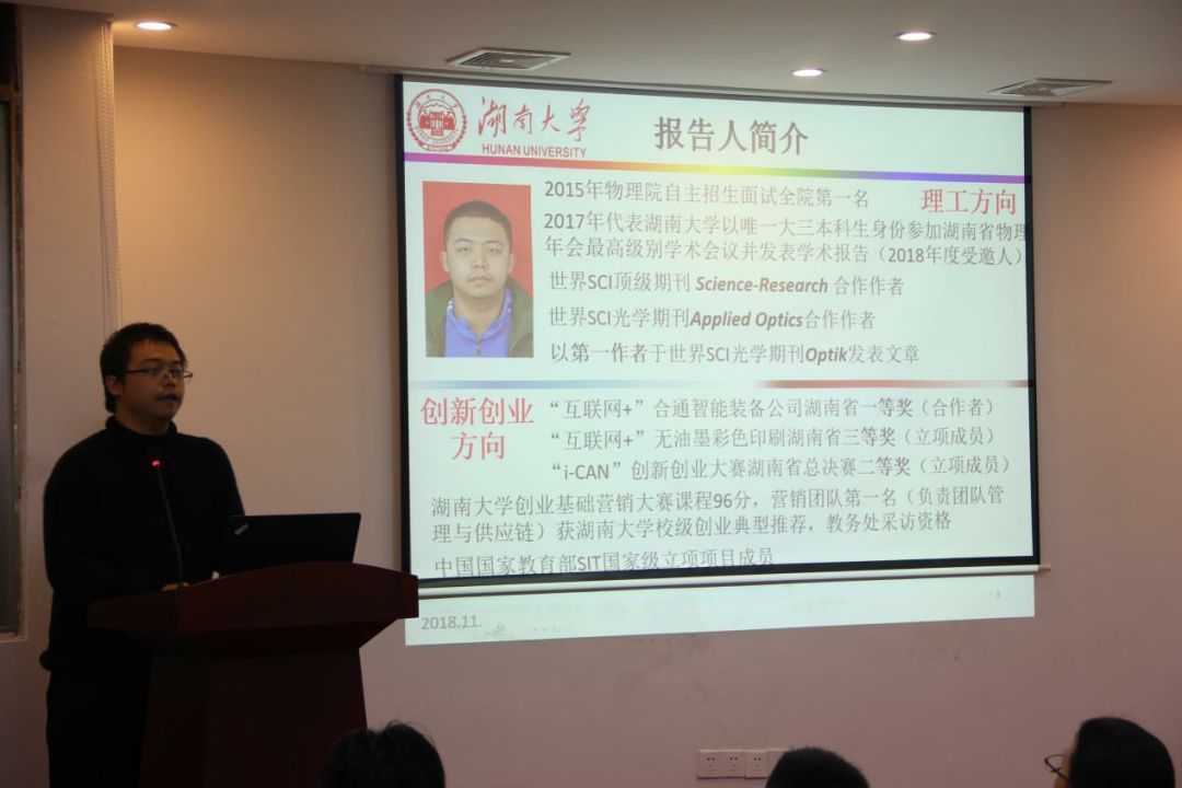 随后,生物学院优秀毕业生王皓冉、物理与微电子科学学院林子豪、龙宇翔三位同学轮流进行创新科研分享,为在座同学们提出了“培养自学能力”、“避免盲目自大”等七条建议,并提出独立经历撰写到文章出版的整个过程才是真正科研入门的过程。来自人和未来生物科技有限公司的杨凌霄从医学诊断、智慧健康管理、基因大数据三个业务板块对企业进行了介绍,加深了学生对于生物医药创新型科技企业的了解。
