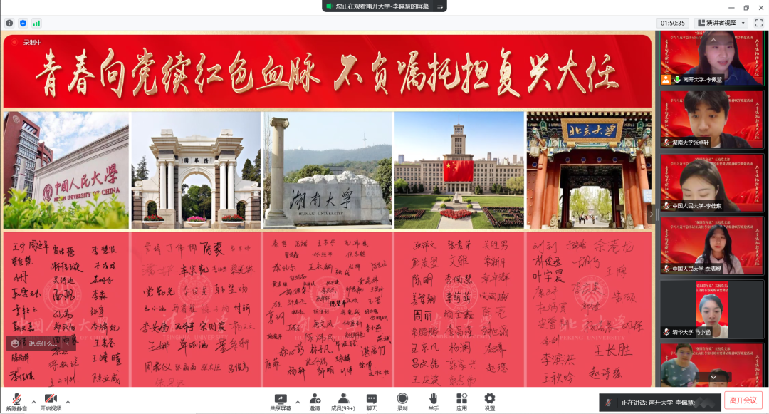 5月12日晚,湖南大学物理与微电子科学学院本科生第一党支部及先锋党建中心与中国人民大学教育学院2020级学硕党支部、清华大学马克思主义学院博士212党支部、南开大学电子信息与光学工程学院光学所博士生第二党支部、本科生第三党支部、北京大学工学院航空研究生党支部联合开展“青春向党续红色血脉 不负嘱托担复兴大任”——“强国青年说”五校党支部学习习近平总书记在高校考察时的重要讲话精神联学联建活动,活动由南开大学光学所博士生第二党支部书记李佩慧主持。