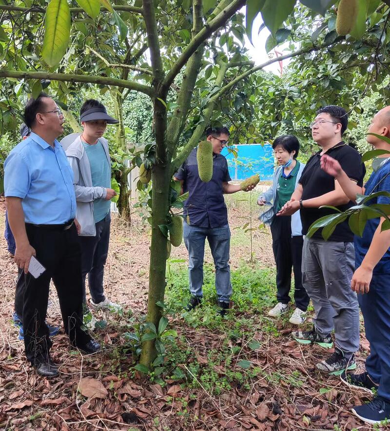 随后,老师们来到琼海市塔洋镇榴莲蜜种植示范园。榴莲蜜是典型的热带果树之一,特别适宜在海南这样的高温高湿地区种植。老师们在调查中发现,园内部分榴莲蜜长势较差,部分植株在果实采收后没有及时进行修剪和保护,致使果梗处遭受一些病菌侵染,树势变弱甚至整株枯死。老师们根据调查结果,从害虫防治以及果实采后果树修剪及保护等方面,给榴莲蜜种植园管理人员提出了综合防治的建议。