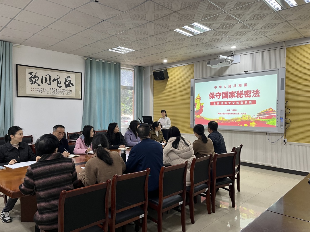 为进一步提高支部党员的保密意识,培养良好的保密习惯和保密行为,积极倡导大家保守国家秘密、维护国家安全,4月25日,全国党建工作样板支部培育创建单位、湖南工程学院管理学院教工第二党支部在新校区F104会议室组织开展了“学保密 知保密 懂保密”主题党日活动。活动由支部书记刘喜梅主持。
