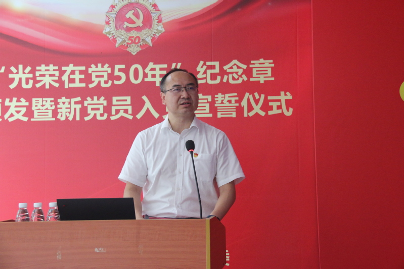 仪式在庄严的国歌声中开幕,首先进行的是“光荣在党50年”纪念章颁发仪式。在热烈的掌声中,3名老党员缓缓地走向台前,晋刚书记郑重地为老党员们颁发“光荣在党50年”纪念章并献上鲜花,向老党员们表示诚挚的祝贺及崇高的敬意。