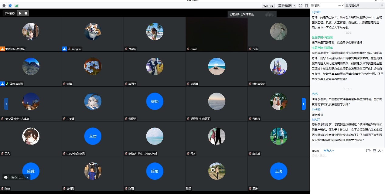 在问答环节,李胜新博士就同学们和家长们关心的生物医学工程专业学生的职业发展、高三学生的专业选择和本科生深造规划等问题进行解答。配合学院招生宣传,让更多有意向报考生物医学工程专业的考生和家长进一步了解专业的就业前景,学院邀请考生和家长参加此次活动,参与的考生家长都表示,通过龙头企业大师的讲座更好地了解专业与产业的未来发展,为指导孩子进行报考提供了宝贵的参考。(图文/肖颖琪)