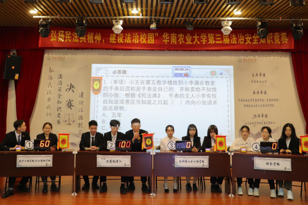 12月6日上午,由校党委宣传部(党委统战部)与人文与法学学院共同举办的华南农业大学第三届法治安全知识竞赛决赛隆重举行。本届法治安全知识竞赛以“弘扬民法典精神,建设法治校园”为主题,相较往年的赛制,在初赛和复赛中首次采用自主研发的“人文素质教育平台”微信小程序答题的模式。竞赛面向全体在校生,历时一个多月共有21个学院逾四千学生参与线上遴选,参赛规模比往届翻一番,最终有八支队伍脱颖而出晋级决赛,与特邀回归的上届比赛冠军队共同进行最后的赛季角逐,以赛促学,以赛促用,增强大学生的法治观念,助推法治校园建设。