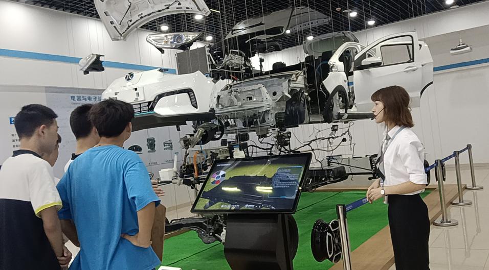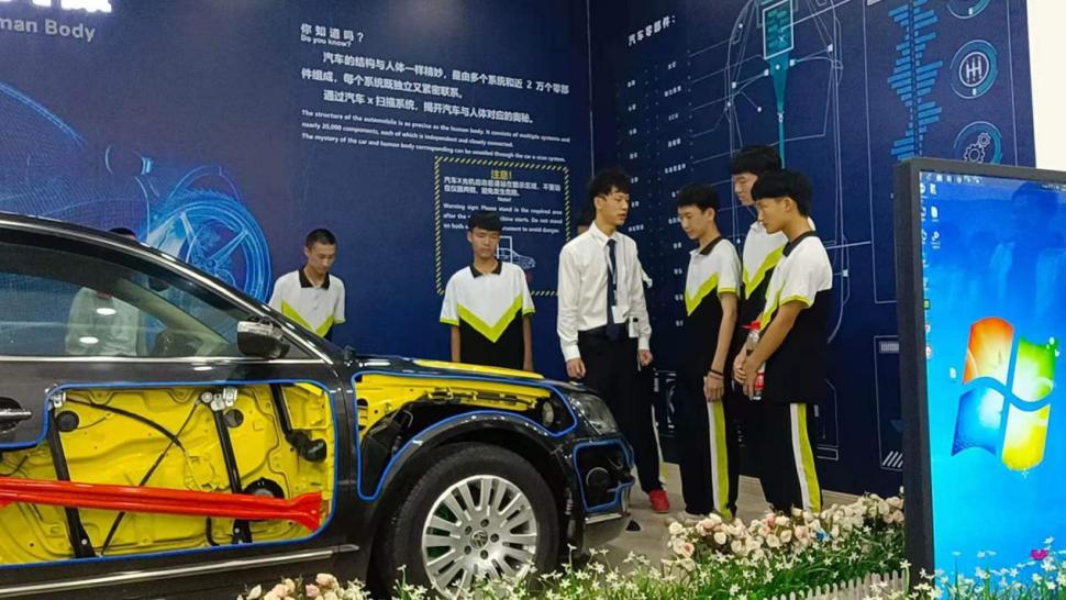 在“探寻汽车奥秘”厅,悬挂着北汽新能源的爆炸车,可以仔细看清楚新能源汽车整体布局,厘清每一个零部件的结构及装配关系,并通过互动演示屏幕、3D全景仿真系统,让所有学习者亲手触摸了解低碳绿色汽车,虚拟体验汽车黑科技。