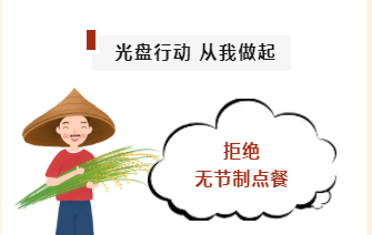 从我做起,拒绝剩餐,争当“光盘行动”的示范者。点菜适量,吃饱为宜,以“光盘”为荣、“剩宴”为耻,珍惜每一粒粮食,自觉维护节俭用餐的良好风气。