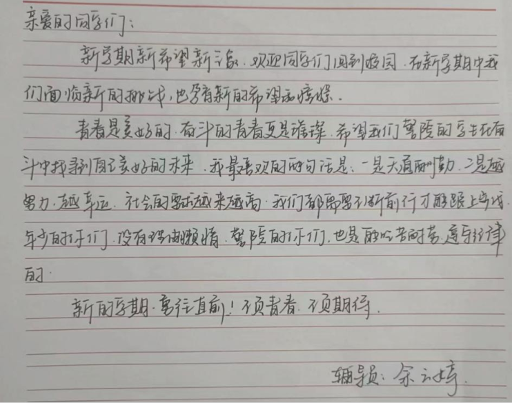 望同学们在新学期中,不负自我,无愧前路,元气满满地踏上征程,全力以赴,愿同学们好好把握青春,好好把握梦想,好好把握自己,好好把握机遇,好好把握前程,以更加饱满的姿态迎接新的挑战!