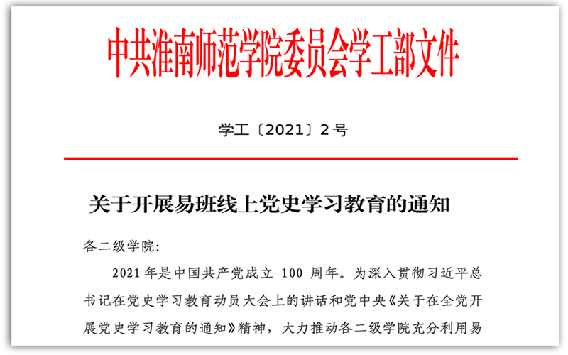 习近平总书记在党史学习教育动员大会上强调,要注重方式方法创新,发挥互联网在党史宣传中的重要作用。根据上级党史学习教育要求,淮南师范学院依托易班网络平台,综合谋划,系统推进,通过制定方案、建设课群、开设专栏、开展主题活动等方式,不断推动党史学习教育落实落细,见行见效,有效引导广大学生学史明理、学史增信、学史崇德、学史力行。