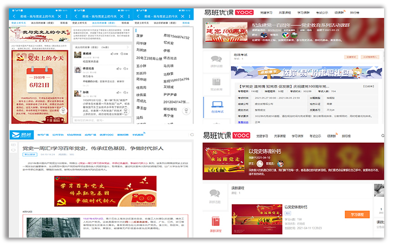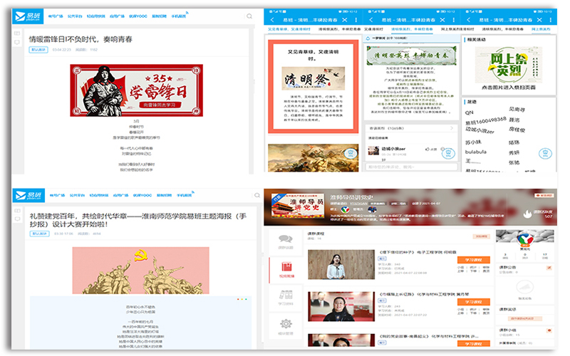 技术赋能,充分发挥易班平台功能优势。依托易班优课、轻应用快搭、微社区等功能模块,进一步丰富党史学习教育形式,积极营造党史学习教育浓厚氛围。2021年以来,建设“党史教育课程 传承红色精神”“党史故事会”“学党史,强信念,跟党走”等党史学习易班优课群34个,累计活跃指数达31571;创建“我与党史上的今天”“学史增信,青年力行”等各类轻应用快搭10余个;开设“党史一周汇”“百年党史,薪火相传”“‘易’心向党”等专题专栏6个;发布党史相关网文320篇。