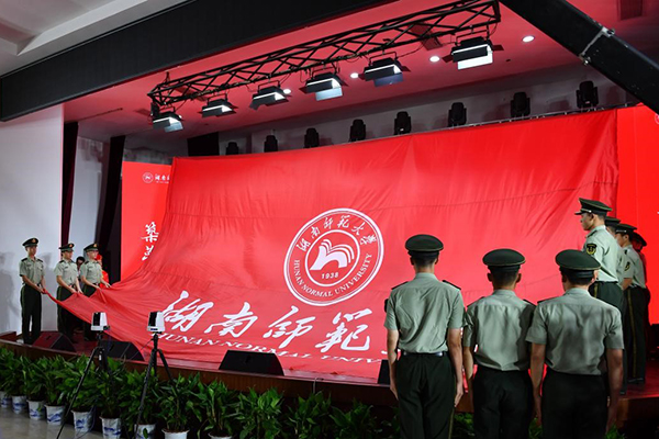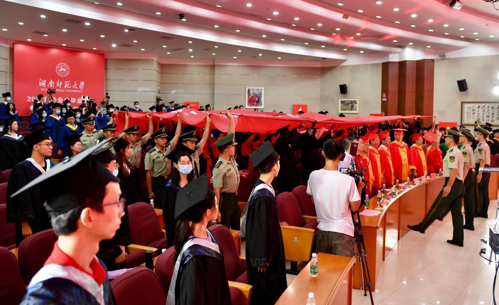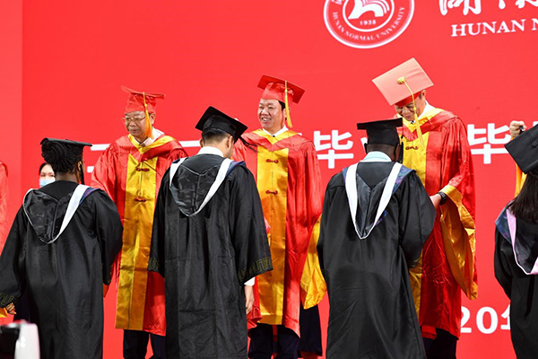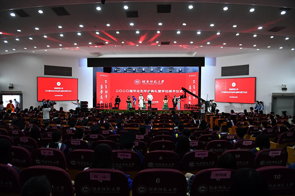 仪式前,学校举行了暖场演出。现场播放了教职工代表及校友代表云毕业典礼祝福视频,音乐学院学生代表弹奏了民乐合奏《喜洋洋》,外国语学院博士研究生代表现场演唱了英文版歌曲《栀子花开》、20余名辅导员代表朗诵了诗歌《我亲爱的学生》、学生代表演唱了改编歌曲《再见,湖南师大》、教师代表演唱了原创校园民谣《二里半》。仪式最后,伴随《我喜欢》毕业典礼祝福视频,全场奏唱校歌,一幅巨型校旗开始在观众席传承,将现场氛围推向高潮。整场典礼仪式在师生互道“木兰路再见”中圆满结束!