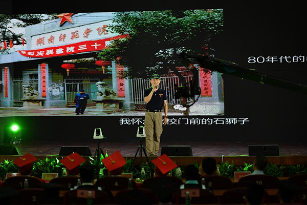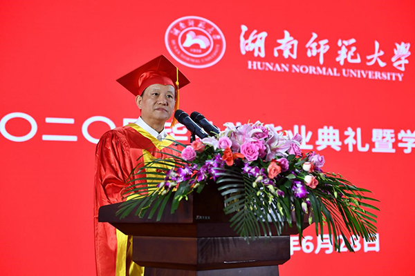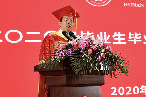 校友代表龚新高院士致辞。他表示,非常荣幸作为校友代表,跟学弟学妹们一道见证人生中最重要的时刻,共享幸福的喜悦,与大家分享作为一位校友对母校的思念之情。他以自己在湖南师范学院最后一天的日记,回顾了在母校求学的四年美好岁月,分享了自己的人生经历与心得,表达了对母校及毕业生的衷心祝福。他表示,对母校的思念之情,是从正式走出校门开始的。尽管大家带不走母校的一草一木,带不走待了四年的教室、给你精神食粮的课堂、流连忘返的岳麓山美景,但可以带走老师的期盼,带走四年的积累与熏陶。他寄语即将毕业的学弟学妹,湖南师大即将成为大家的母校,感恩过去是必要的,但更重要的是创造未来。希望大家珍惜当下时时刻刻,相信自己的能力,选择好自己的路,脚踏实地,一步一个脚印,相信大家一定会走好自己的路。作为一位优秀大学生,祖国的未来,在实现中国梦的伟大征程中,时常也应该仰望星空,想想母校的校训,追求真理,追求高尚,追求卓越!