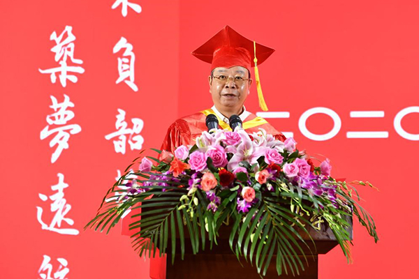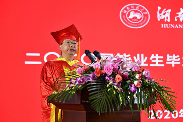 校长刘起军教授以“将奋进的青春融入强国的征程”为主题发表讲话,并代表学校向毕业生表示热烈祝贺,向关心、培养大家的亲人和老师表示衷心感谢。他动情地说,因为疫情,很多同学不能像以往的毕业生一样,在典礼现场受一次“拨穗礼”,在校门前拍一张“全家福”。虽然留下一些遗憾,但大家经历了这次抗疫的历练,一定会更加懂得珍爱生命、敬畏自然,更加懂得守望相助、同舟共济,更加笃定报国之志,坚定爱国之心。他用习近平总书记的话“时间属于奋进者!历史属于奋进者!”勉励大家走出校园后,在危机中育新机、于变局中开新局,将奋进的青春融入强国的新征程。他提出,大家要坚定报国志,将理想融入复兴大局,始终与党同心、与人民同行、与时代同步伐,不负韶华,报效祖国;常怀求知心,用创新应对时代变局,成为党和国家的栋梁之材,不断续写学校新的辉煌;争当奋进者,以实干开拓人生新局,与最优者“对标”,与最强者“比拼”,与最快者“赛跑”,用奋斗擦亮青春底色,以实干担当时代重任。最后他表示,母校就是大家的家,就是大家心灵的港湾。母校的大门永远为大家敞开!真诚地祝福大家,建功新征程,圆梦新时代!