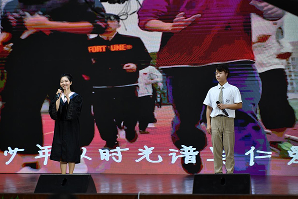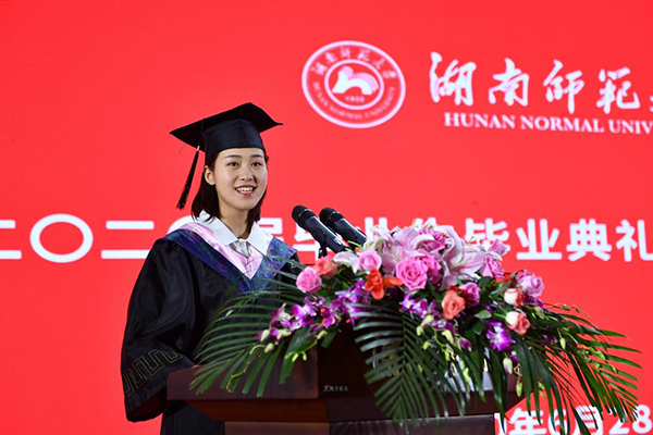 文学院2016级汉语国际教育专业本科生高子妍作为毕业生代表发言。她回忆了自己在学校的求学和成长经历,表达了对母校、老师、父母亲友的感激之情,向疫情期间默默奉献的人表达了崇高敬意。