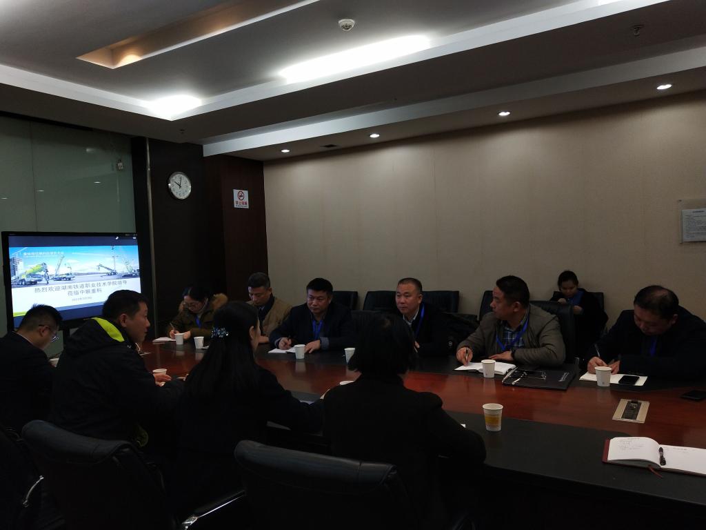 在中联重科,人事部长谢娟萍、售后服务部主任石凯伟热情接待了方小斌校长一行,在座谈会上,谢娟萍介绍了公司运行情况、人才需求及校企合作方式。方小斌简要介绍了学校发展情况、办学特色、人才培养、专业设置、社会服务等方面。校企双方就如何培养符合现代企业要求的具有家国情怀、工匠精神的特质学生展开了热烈交流,初步达成了共同组建订单班、现代学徒制合作办学、履带吊和汽车吊特种专项作业车培训等多项合作意向。