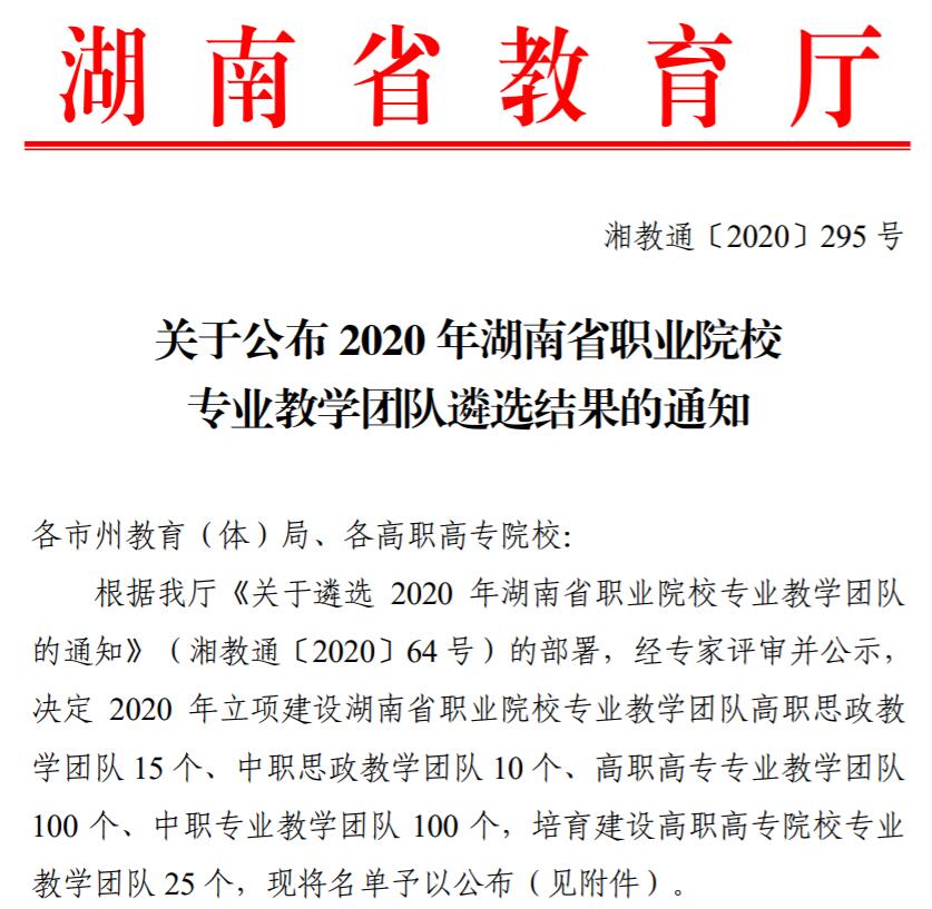 近日,根据湖南省教育厅发布的《2020年湖南省职业院校专业教学团队遴选结果的通知》(湘教通 2020 295号),我校以马克思主义学院院长田文艳教授领衔的思想政治教学团队入选湖南省职业教育专业教学团队建设项目。