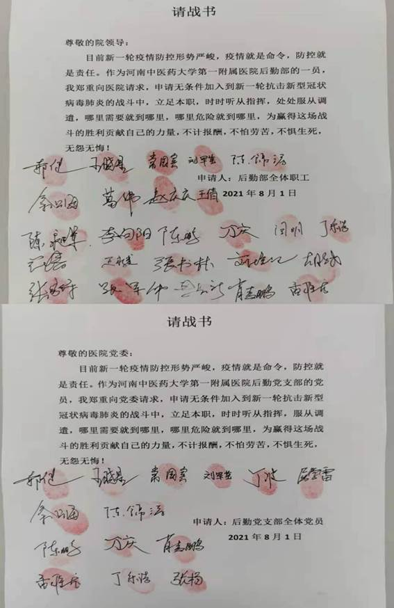 8月3日下午3点50分,我院接到河南省卫健委紧急通知,要求一附院派出管理团队到郑州市第三人民医院惠济院区开展医疗救助管理工作。接到通知后,医院党委迅速作出安排部署,医院副院长王海峰、第四附属医院(龙子湖院区)副院长冯博、后勤部主任秦静海、疾病控制科主任宋清、护理部副主任林志红五位同志临危受命,组建“党员突击队”奔赴新的工作岗位。