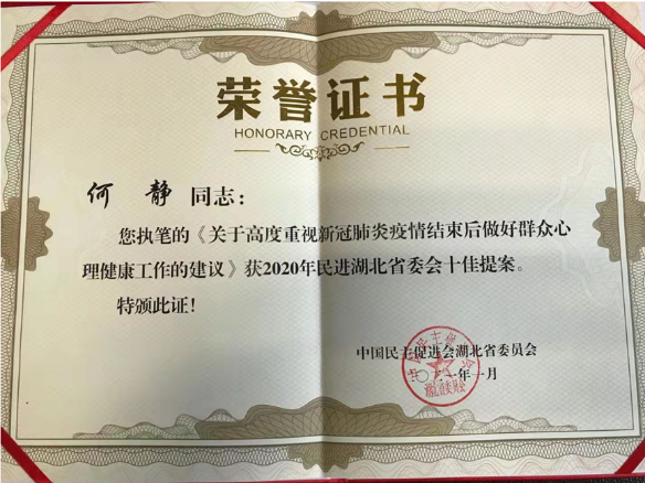 此外,学部何静副部长参与完成的全国政协十三届三次会议的党派书面发言《重视健康心理,成就阳光少年》,被评为民进中央2020年度参政议政成果二等奖;执笔的《关于高度重视新冠肺炎疫情结束后做好群众心理健康工作的建议》获2020年民进湖北省委会十佳提案。