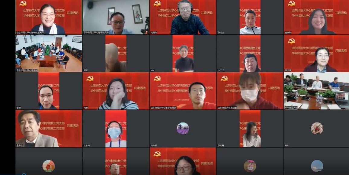 在全党深入学习贯彻党的二十大精神之际,为深入推进高校“双带头人”教师党支部书记工作室联动联建,促进党建和业务工作交流,共谋互促发展,2022年11月11日下午,华中师范大学心理学院教工党支部联合山东师范大学心理学院教工党支部开展“党建引领业务、共建互促发展”合作共建活动,以线上研讨交流的形式,就支部建设与人才培养进行了深入交流。会议由华中师范大学心理学院教工党支部书记王伟军和山东师范大学心理学院教工党支部书记王美萍共同主持。华中师范大学心理学院和山东师范大学心理学院领导、支部成员和部分教师参加了会议。