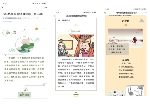 为弘扬廉洁文化,传播廉洁正能量,依托学院公众号开设的专栏,学习清廉诗词和廉政典故,通过《石灰吟》《墨梅》等清廉古诗赏析,《杨震拒金》《晏婴一裘》等廉政典故领读,把廉洁教育融入日常,让廉洁种子潜移默化根植于心间。