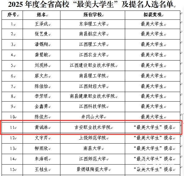 近期,江西省教育厅公布2025年度江西省高校“最美大学生”,吉安职业技术学院机械与电子工程学院23级机电三(2)班学生黄诚淋获提名。黄诚淋曾获2023-2024学年度国家励志奖学金、2024年世界职业院校技能大赛国家级银奖、2025年世界职业院校技能大赛国家级铜奖、中国国际大学生创新大赛国家级铜奖等奖项10余项。他品学兼优、技能突出、心怀感恩,以其坚韧不拔的奋斗精神和显著的成绩,成为了同学们身边的榜样。
