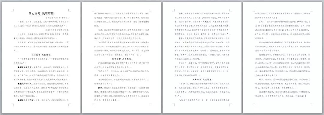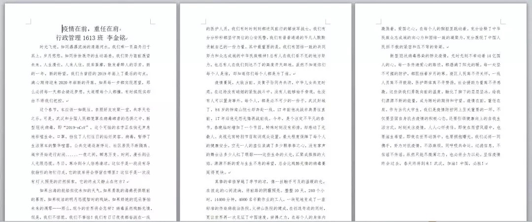 在此次征文活动中,公管学子们用细腻的笔触描绘身边的战“疫”故事,或热切真诚地敬佩着最美的逆行,或激情澎湃地赞美着人间的大爱。一字一句无不表现了战胜疫情的赤诚之心,无不表达了祝福祖国的拳拳之情,充分激发了公管学子自觉肩负起时代赋予的使命和责任,做好“守护者”、“修行者”和“识途者”,以自己的实际行动为夺取抗击新型冠状病毒感染肺炎疫情斗争的胜利作出应有贡献的坚定信念。经过为期两周的广泛征收和层层审核,学院最终评选出20篇优秀征文。我们相信:终将迎来一个吐露芬芳的春天,春天也必将迎来一群健康向上的青年!