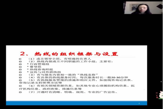 北京理工大学心理学系贾晓明教授以“抗疫心理援助热线工作指南解读”为题,讲授了抗疫心理援助热线的目标与原则、援助热线的建立、人员的筛选条件与管理、援助热线的特点、基本工作流程与技巧等;清华大学心理学系樊富珉教授以“心理援助的意义及援助中的伦理关注”为题,从心理援助的意义与功能、目标与人群以及援助中需要关注的伦理议题等方面进行了讲解;清华大学学生心理发展指导中心主任李焰教授以“心理热线的接线流程”为题,从问题分级分类、心理救助流程、危机干预流程、热线工作伦理等方面进行了讲授;以“用叙事治疗的视野发现来电者的力量”为题,从心理救助的资源取向、资源取向的基本理念、资源取向的话术等方面进行了讲授;大连理工大学心理健康教育与咨询中心主任胡月教授以“心理援助咨询师的自我防护”为题,从自我防护的定义、为什么要自我防护、自我防护的方法等方面进行了讲解。每一场课程讲授之后,专家们都与参训老师进行了线上交流,对老师们提出的问题给予详细解答。
