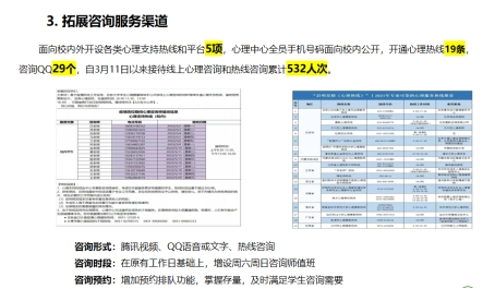 疫情初期,迅速成立抗疫专班,健全工作制度,协同专家学者、心理医生、专兼职心理咨询师、学生朋辈心理辅导员、心理委员、学生心理工作志愿者等群体组建心理抗疫“特战队”,打通时空局限,加强分析研判,提升工作效度。同时,全面深化教育教学,攻克心理抗疫“主战场”:不啻做好疫情期间的线上教学转换,更借助课堂主渠道增大覆盖面,注入心理抗疫思政元素,引导学生关爱自身心理健康;充分发挥网络平台宣教效能;“画线成面”,以朋辈为纽带深化心理支持。拓宽心理抗疫“根据地”,丰富拓展多维咨询云服务:校内全人员、全途径、全时段实现“三全并举”;校外拓宽渠道,收集全国支持资源。通过动态心理动态调研、特殊需求特殊通道、重点人群重点关注三大举措,精准强化危机干预,筑牢心理抗疫“防火墙”。最后,多元并举宣教指导,打造心理抗疫“充电站”:加强思想引领、丰富心理支持、营造学术氛围同时注重知识普及,创设关注心理健康轻松文化环境。