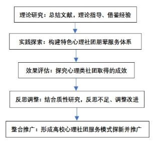 首先,进行理论研究。通过文献研究,了解国内外各高校心理类社团或学生朋辈组织的架构、职能、特点、发展现状等,为研究提供理论基础和指导。而后,进行实践探索。结合吉林大学心理类社团发展情况和前期调研,通过对比研究与实际工作资料总结,构建吉林大学特色心理社团朋辈服务体系。之后,进行效果评估。采用调查法、访谈法了解心理类社团在促进学生心理健康水平工作方面取得的成效。接下来,进行反思调整,通过质性研究总结出心理类社团的效能发挥机制,反思局限,调整创新,为后续实践研究提供参考。最后,整合推广。在前期工作的基础上,进行心理社团服务模式探新,并将新模式逐步推广(见下图)。