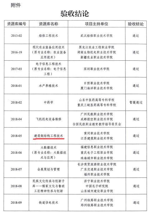 近日,教育部发布《关于公布职业教育专业教学资源库2021年验收结果的通知》(教职成司函〔2022〕20号),我校与黄冈职业技术学院联合主持的“建筑钢结构工程技术专业教学资源库”项目顺利通过验收。