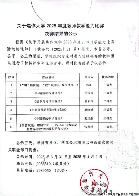 近年来,机电工程学院持续深化“以赛促教”机制,始终将教师教学能力提升作为人才培养的核心抓手。学院通过青年教师助课制、校企联合教研项目等举措,完善教师发展体系。此次获奖不仅是对教师个人能力的肯定,更是学院深化职业教育教学改革、推进课程建设的重要体现。