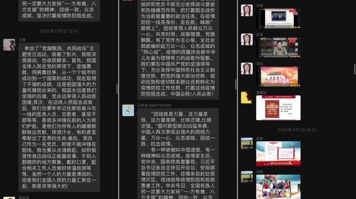 本次微党课的学习,让我们明白党员干部要加强作风建设,严肃工作纪律,勇挑重担,以过硬的工作作风和铁的纪律打赢疫情防控阻击战。观看结束后党员同志纷纷在党员群中分享交流自己的心得体会,发表了对此次党课的感想,更加坚定了为人民服务的信念!