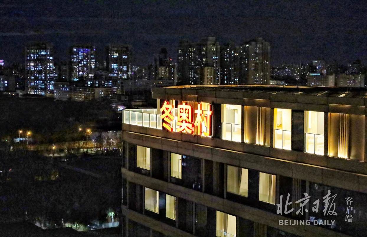 建筑外立面上的“冬奥村”三个字首次点亮。