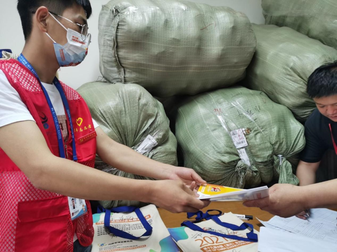 早上6点30分,志愿者们于源汇校区集合,前往会展中心。8点志愿者们正式上岗。现场安保组的志愿者们分布于会展中心的南门与西门,负责维持进场秩序、管理闸机,确保进场有序。主场服务组的志愿者们,提前熟悉场地,携带会场的布局地图,在场馆的各个地方为参展人员进行指引,便于参展人员快速地前往目的地。资料组的志愿者们负责资料的搬运和整理,并在办公室进行资料的分装和发放。展览展示组的志愿者们分为两小组,一小组对论坛、签约仪式、峰会进行记者的接待,为媒体记者们指引方向,提供帮助。另一小组在场馆内进行安全隐患排查,对有隐患的商铺进行提醒。跟车服务组的志愿者们前往酒店,带领嘉宾前往会场,并为嘉宾答疑解惑。